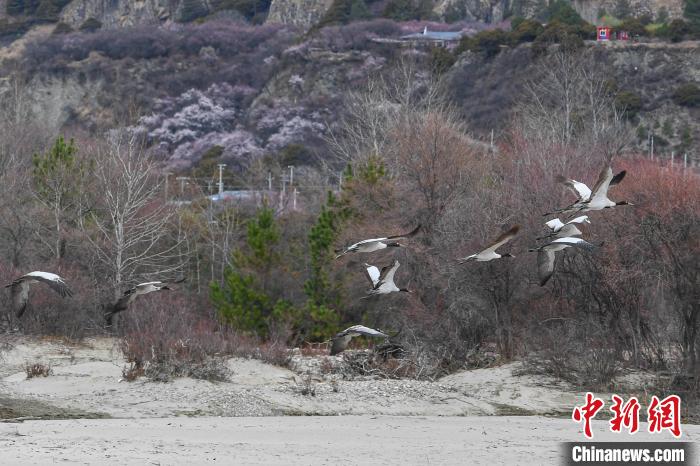圖為桃花前飛翔的黑頸鶴。貢嘎來松 攝