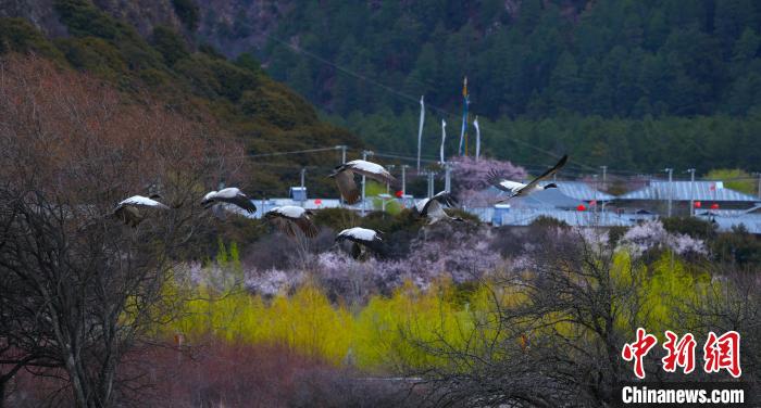 圖為桃花前飛翔的黑頸鶴。索朗多杰 攝