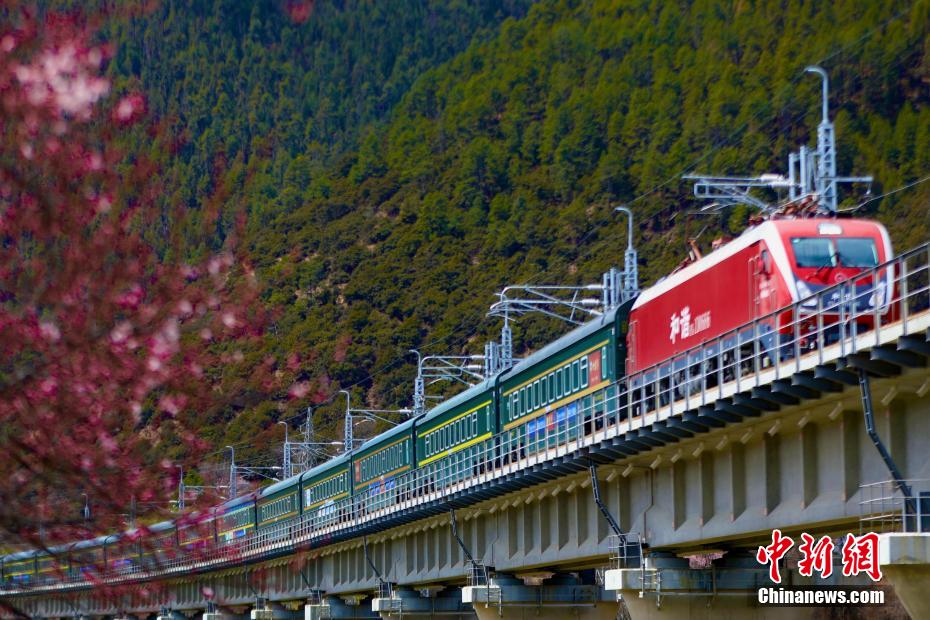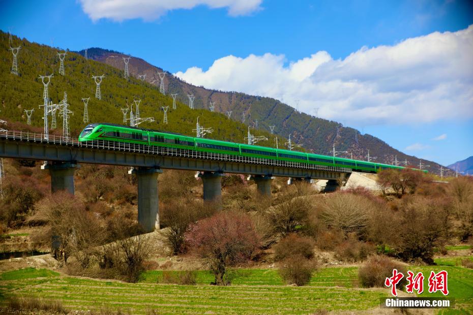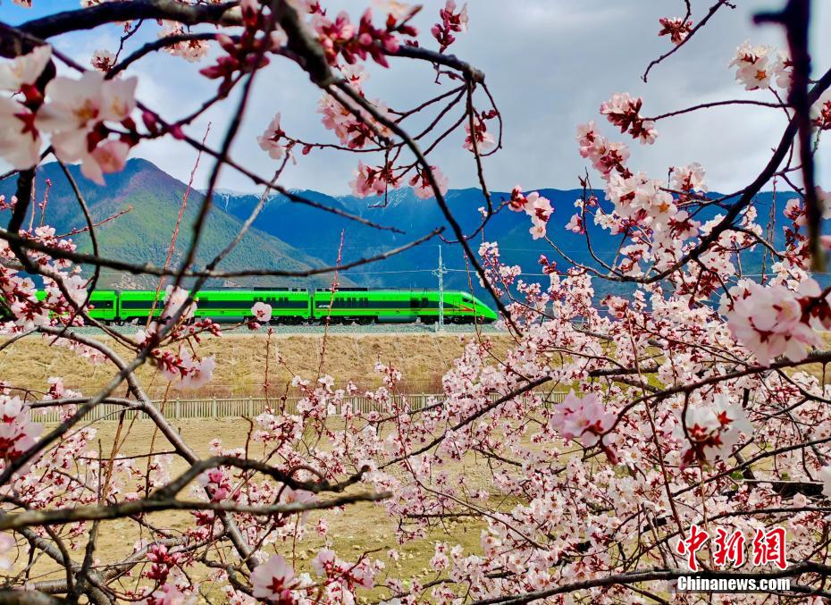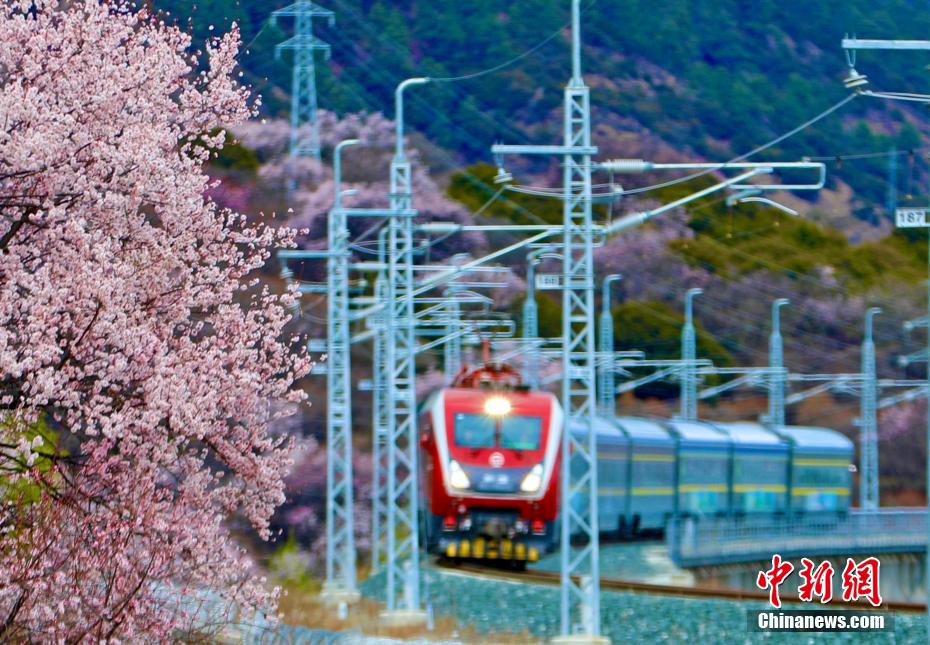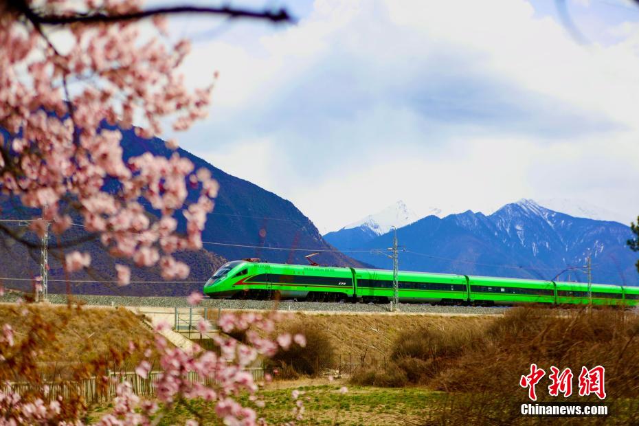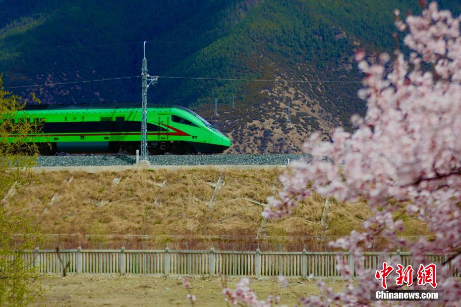 被譽(yù)為新“天路”的拉林鐵路,是中國(guó)首條高原電氣化鐵路,于2021年6月25日開通運(yùn)營(yíng),結(jié)束了西藏東南地區(qū)不通鐵路的歷史。圖為拉林鐵路沿線桃花盛開,與飛馳而過的動(dòng)車構(gòu)成別樣風(fēng)景圖。馬生明 攝