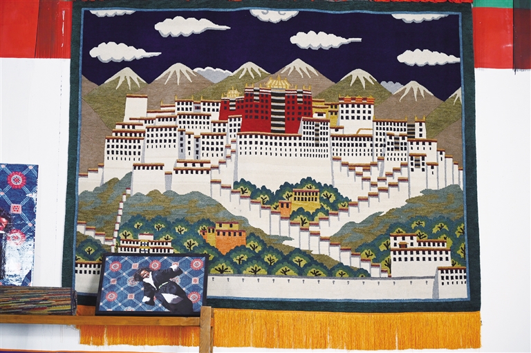 在藏毯廠陳列廳里,懸掛著一幅以布達(dá)拉宮為題材的藏毯?!把矍暗倪@幅藏毯已經(jīng)懸掛十年,沒有任何變形?!笨ν邎?jiān)藏毯廠工作人員彭志紅說,可見手工藏毯的質(zhì)量絕佳。