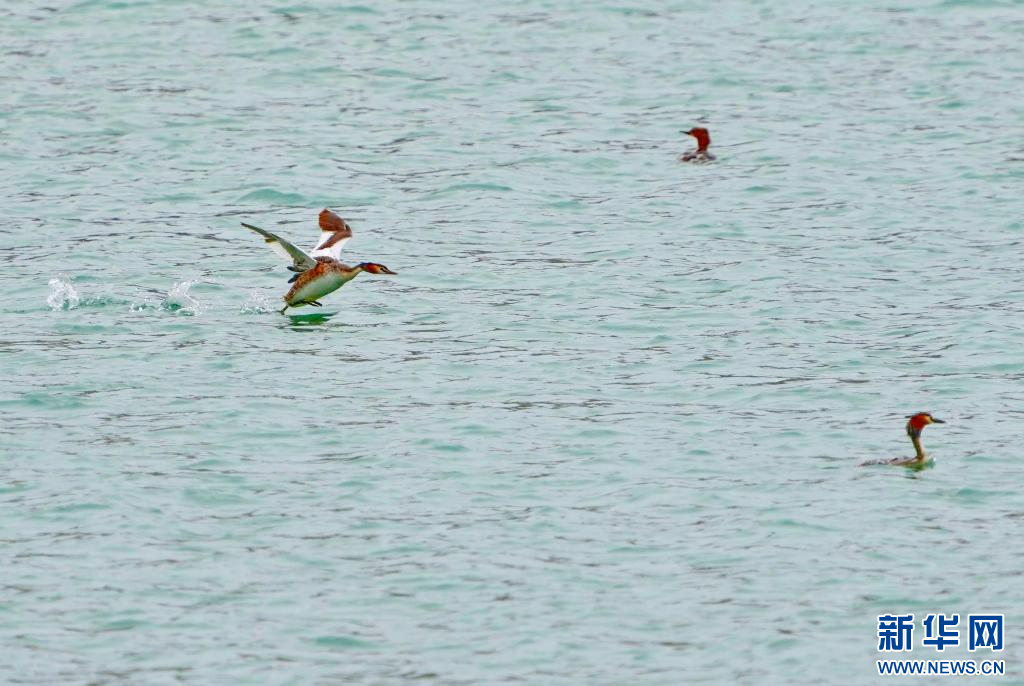 鳳頭 在虎頭山水庫的水面上飛翔(4月24日攝)。新華社記者 張汝鋒 攝