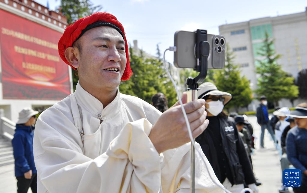5月12日,在西藏職業(yè)技術(shù)學(xué)院職業(yè)教育活動周啟動儀式暨比如縣非物質(zhì)文化遺產(chǎn)進校園活動上,來自比如縣的一名旅游推介者在做現(xiàn)場直播。新華社記者 張汝鋒 攝