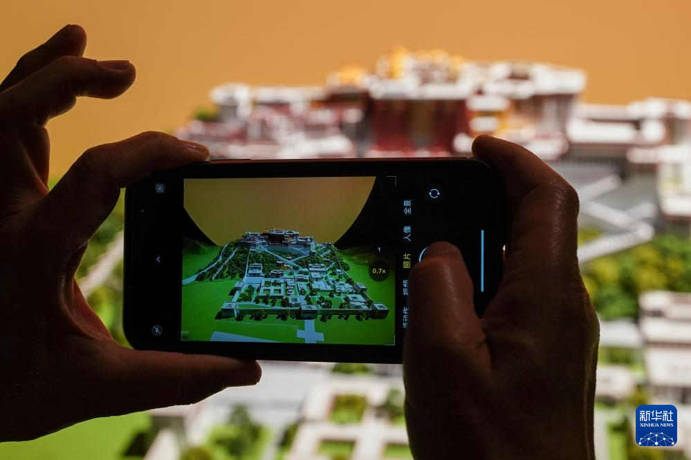 5月11日,觀眾在展出現(xiàn)場(chǎng)參觀拍攝布達(dá)拉宮模型。新華社記者 李博 攝