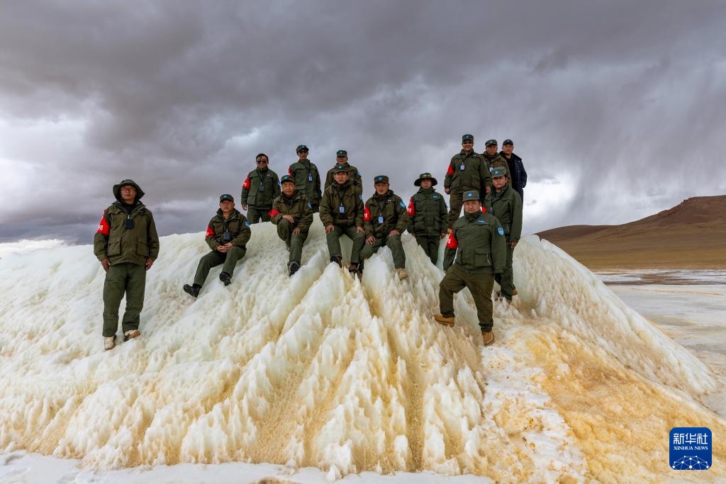 野生動(dòng)物專(zhuān)業(yè)管護(hù)隊(duì)員在巡護(hù)路上一處埡口的冰雪堆上合影(5月7日攝)。新華社記者 姜帆 攝