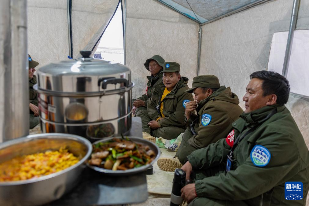 野生動(dòng)物專(zhuān)業(yè)管護(hù)隊(duì)員們?cè)谒逘I(yíng)的帳篷中準(zhǔn)備吃飯(5月7日攝)。新華社記者 姜帆 攝