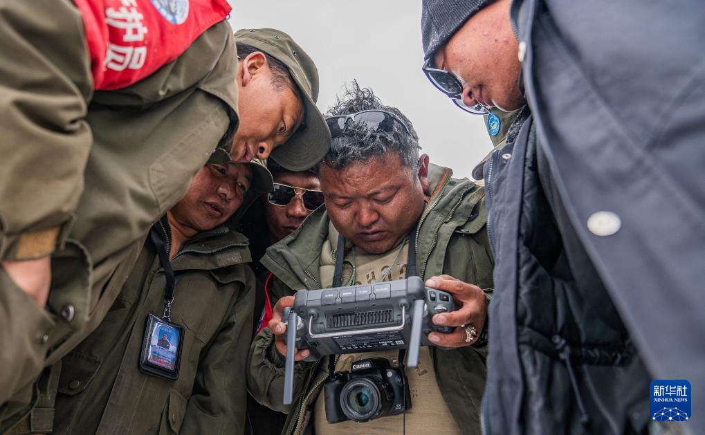 羅布玉杰管護(hù)站站長(zhǎng)格桑倫珠(右二)和隊(duì)員們?cè)诖笱┲胁僮鳠o(wú)人機(jī)觀(guān)察藏羚羊遷徙情況(5月10日攝)。新華社記者 丁增尼達(dá) 攝