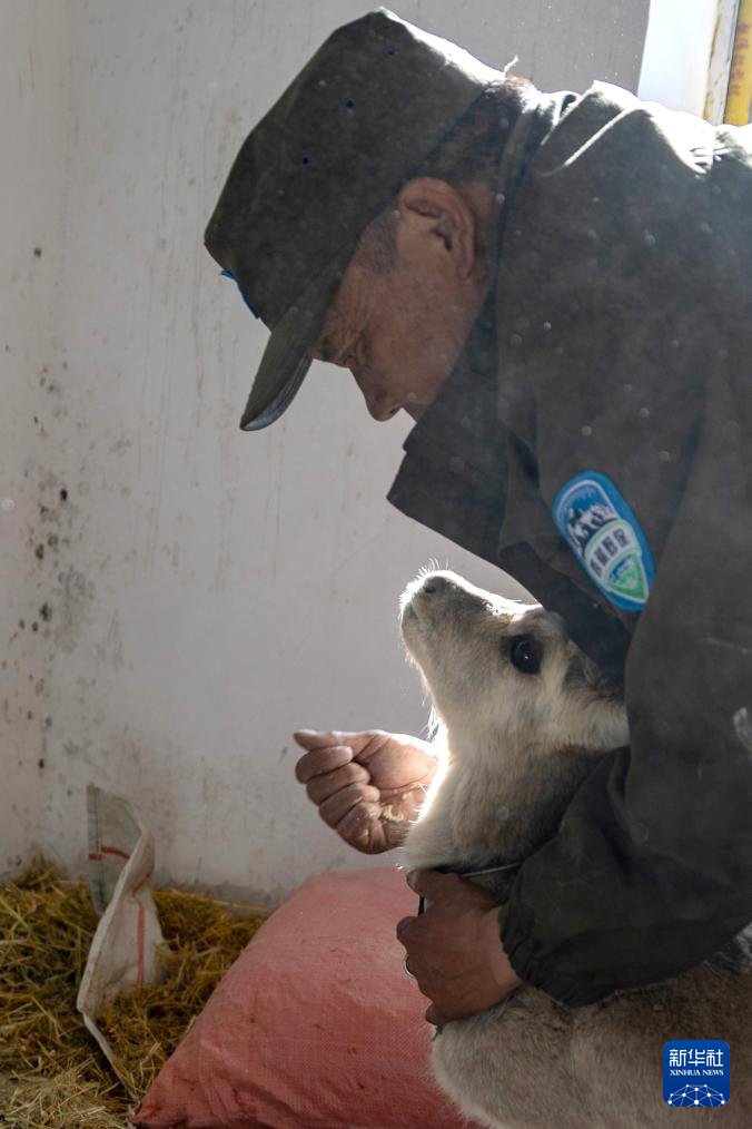 羅布玉杰站的野生動(dòng)物專(zhuān)業(yè)管護(hù)隊(duì)員在出發(fā)巡護(hù)前給站里救護(hù)的受傷藏原羚喂糌粑(5月7日攝)。新華社記者 姜帆 攝
