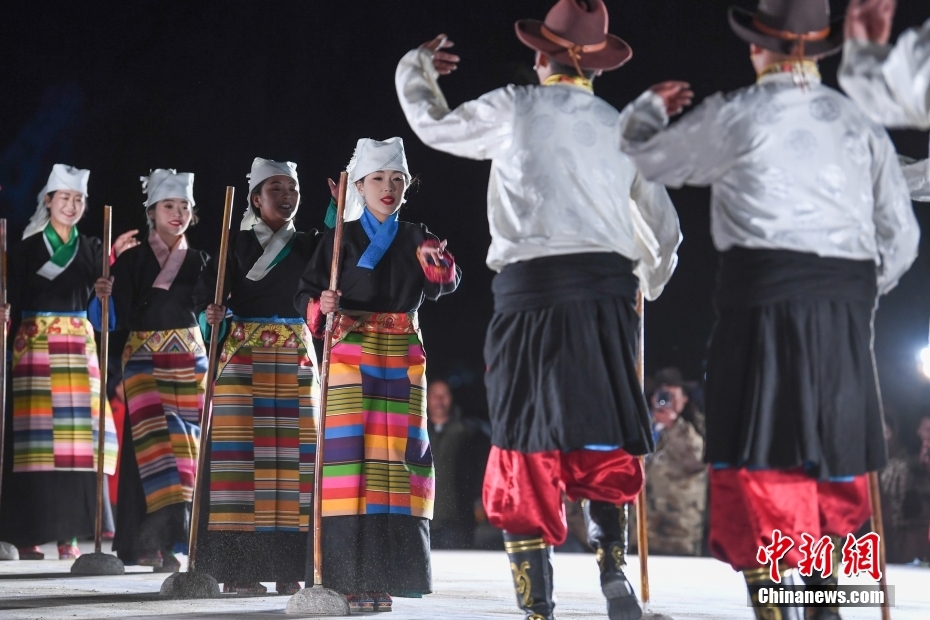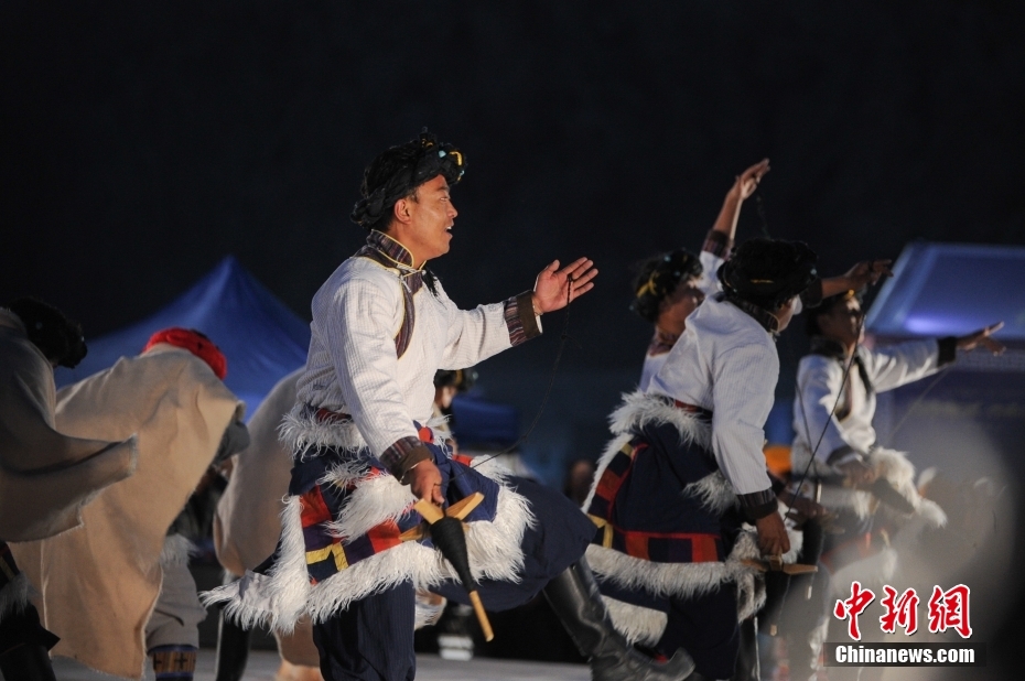 5月18日晚,西藏拉薩市當(dāng)雄縣納木錯湖畔,當(dāng)?shù)啬撩駧в慰腕w驗篝火鍋莊舞。納木錯,被譽(yù)為“天湖”,吸引著大量游客前來觀光。圖為篝火鍋莊舞晚會上的文藝演出。
