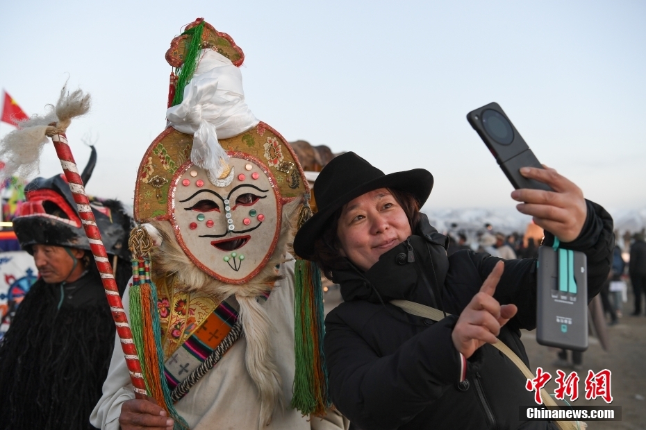 5月18日晚,西藏拉薩市當(dāng)雄縣納木錯湖畔,當(dāng)?shù)啬撩駧в慰腕w驗篝火鍋莊舞。納木錯,被譽(yù)為“天湖”,吸引著大量游客前來觀光。圖為游客跟演職人員合影。