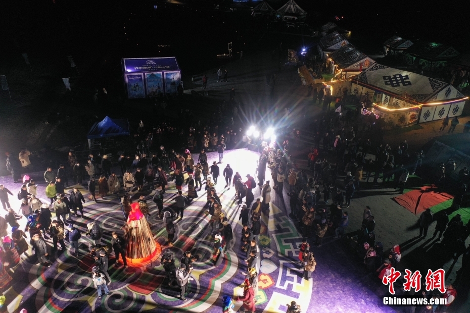 5月18日晚,西藏拉薩市當(dāng)雄縣納木錯湖畔,當(dāng)?shù)啬撩駧в慰腕w驗篝火鍋莊舞。納木錯,被譽(yù)為“天湖”,吸引著大量游客前來觀光。圖為牧民帶游客體驗篝火鍋莊舞現(xiàn)場。