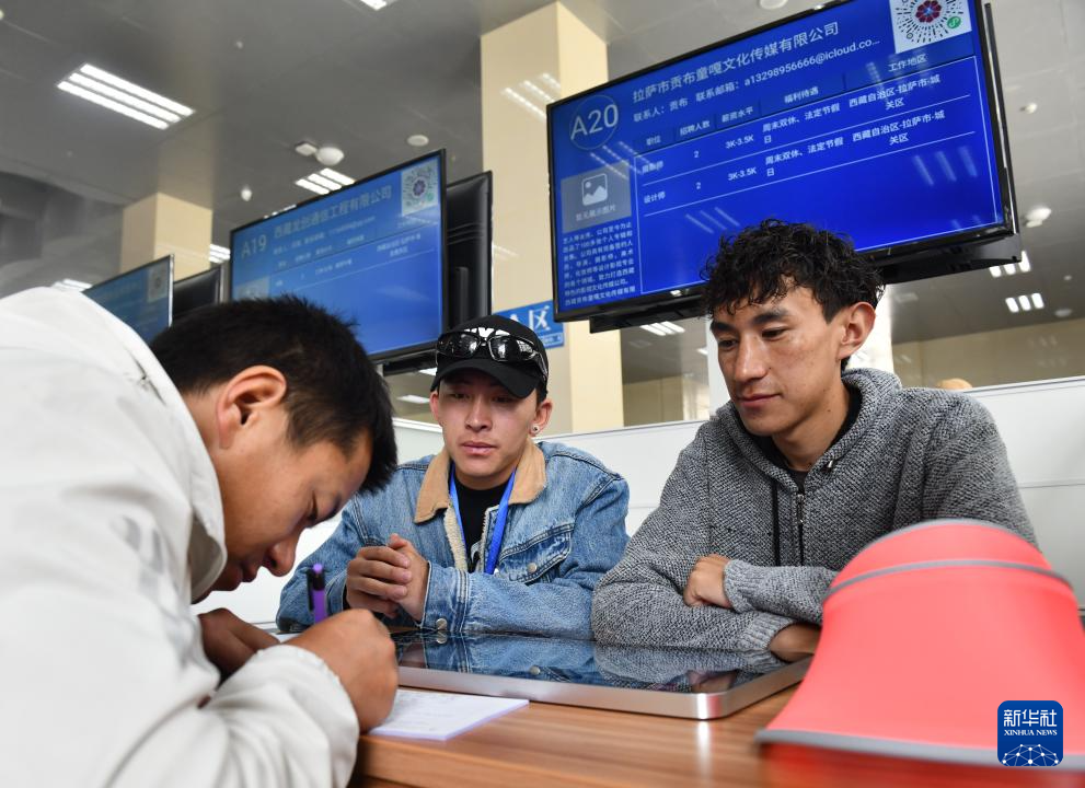 5月24日,在招聘會現(xiàn)場,求職者(左)在給用人單位填寫個人資料。新華社記者 晉美多吉 攝