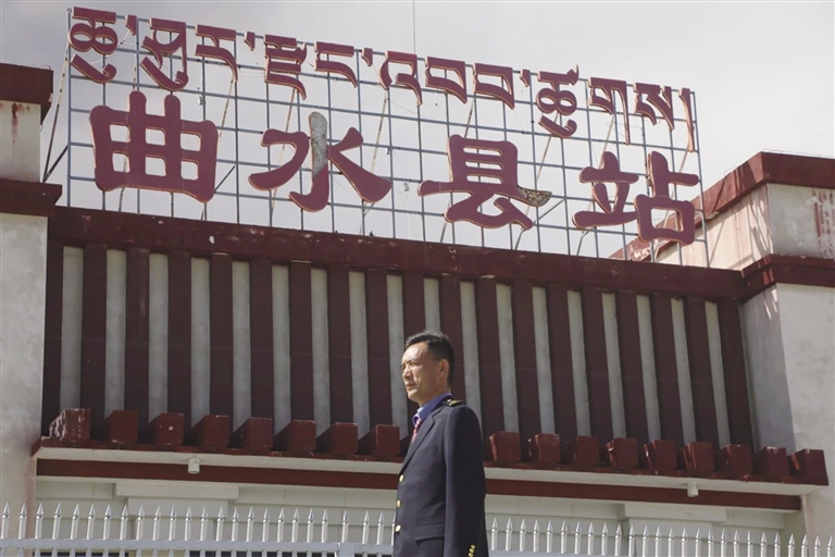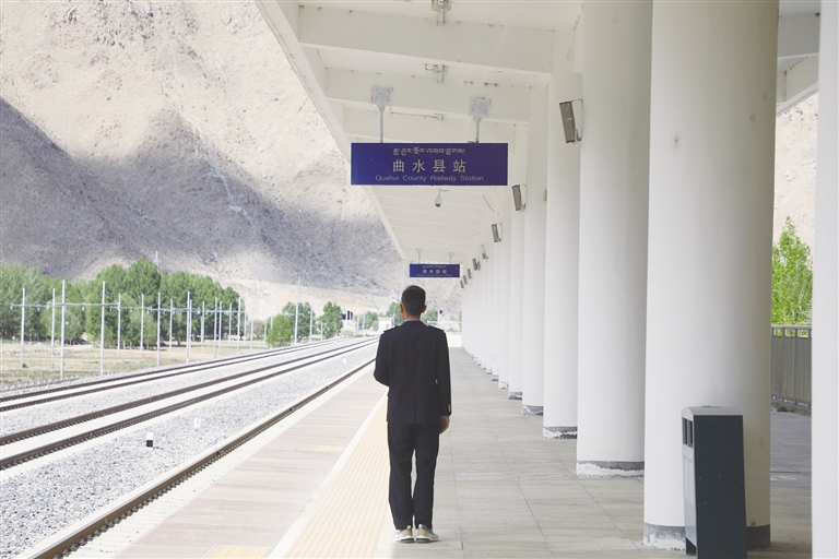 每天,清晨的第一縷陽(yáng)光還未穿透遠(yuǎn)方的山巒時(shí),車(chē)站值班員賀文貴已經(jīng)站在曲水站的站臺(tái)上,開(kāi)始了他日復(fù)一日的工作,查看股道是否有異物,是否有動(dòng)物進(jìn)入站場(chǎng)。曲水站與其他站不一樣,根據(jù)工作安排,平時(shí)這里只有一個(gè)人當(dāng)班應(yīng)急值守,沒(méi)有旅客上下站,時(shí)而駛過(guò)的火車(chē),是這里唯一的來(lái)客。目之所及,只有遠(yuǎn)處的雪山、農(nóng)田和滾滾向前的雅魯藏布江水。