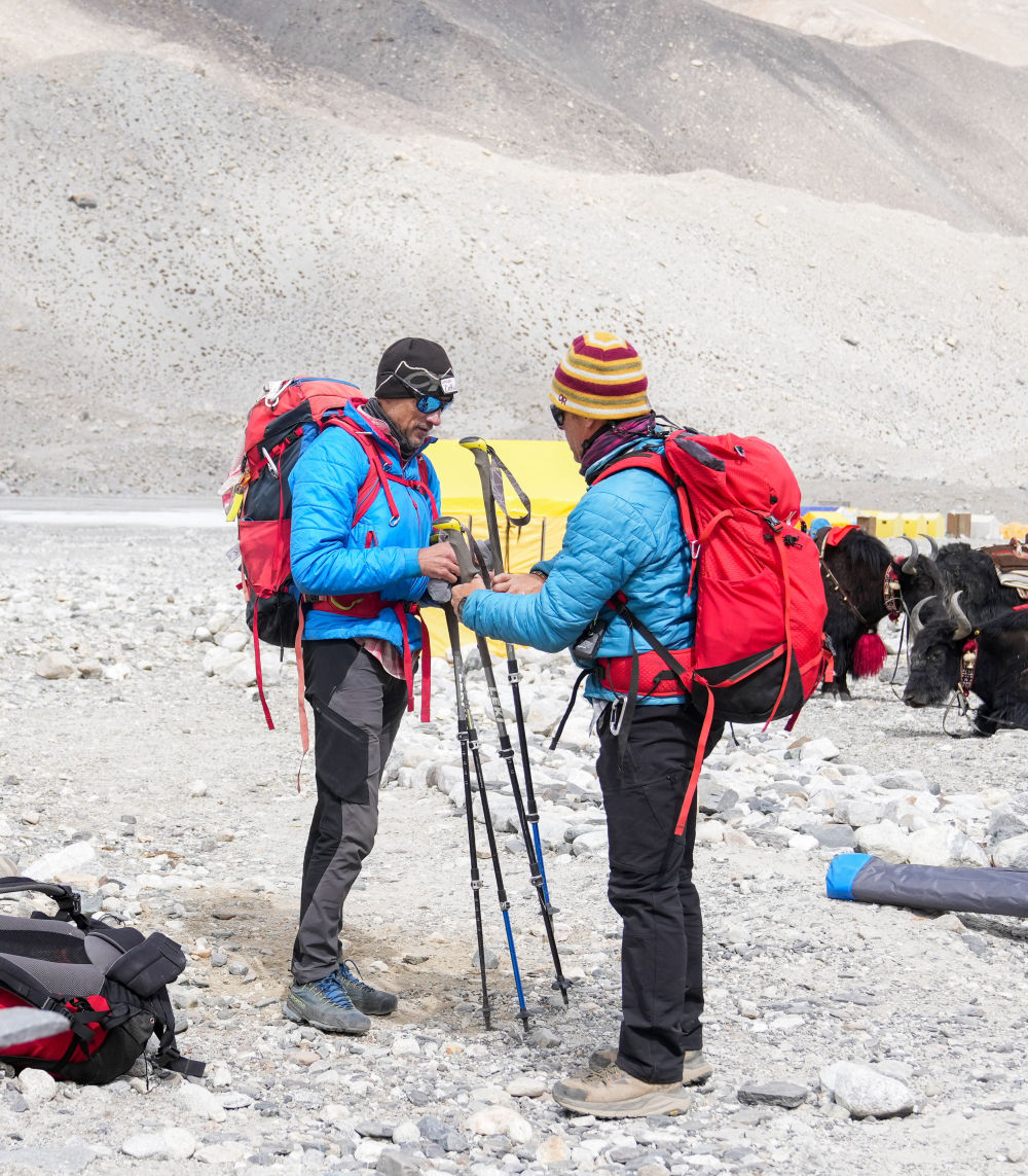 在珠峰登山大本營(yíng),弟弟帕斯卡爾·德諾埃爾(左)在和哥哥多米尼克·德諾埃爾互相檢查登山裝備(5月18日攝)。新華社記者 丁汀 攝