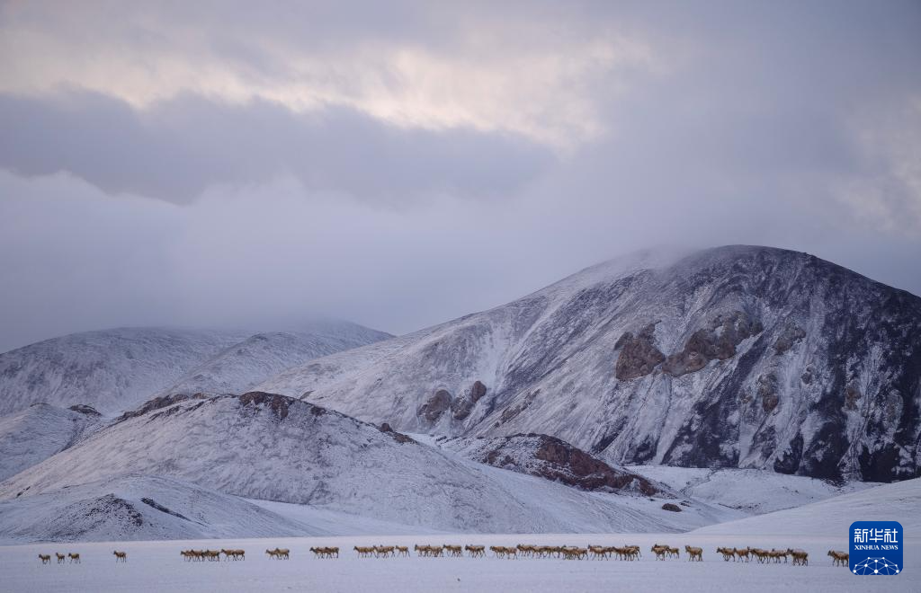 大群遷徙的藏羚羊翻越覆蓋著積雪的山梁(5月10日攝)。新華社記者 姜帆 攝