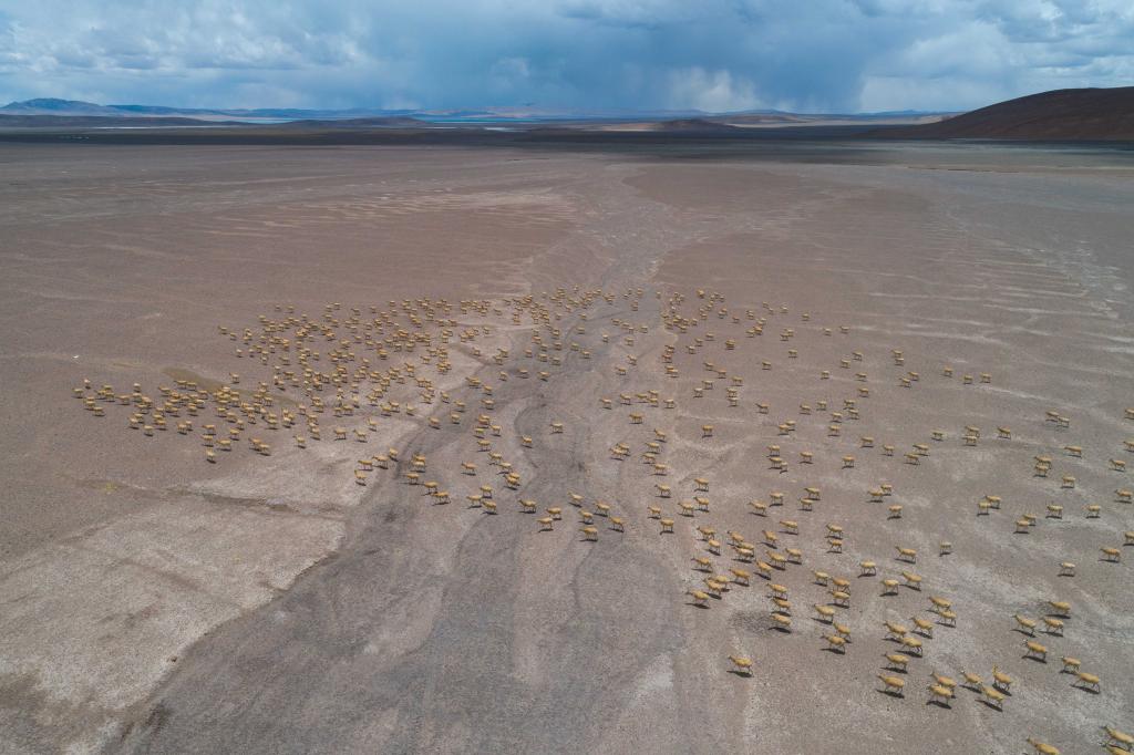 藏羚羊在羌塘保護(hù)區(qū)核心區(qū)向產(chǎn)羔地遷徙(6月13日攝 無人機(jī)照片)。新華社記者 旦增尼瑪曲珠 攝