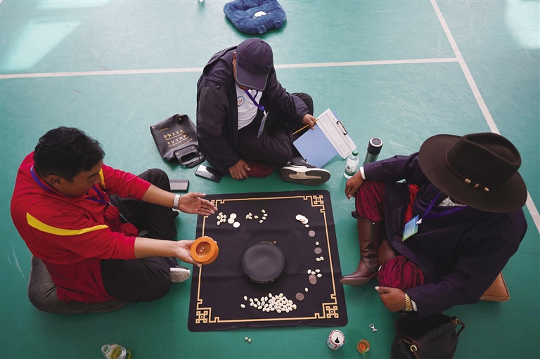 當(dāng)日,“吉韌”“秀茲”等項目一同開賽?! 凹g”也叫藏式克郎球,是藏族的一種彈指運動。比賽在一張邊長約1米的正方形木桌球臺上進(jìn)行,球臺四角有4個小洞,黑、白兩種扁圓形球子各9個,另有1個紅色球子放置在球臺中心,1個白色母球供雙方彈擊球子所用。