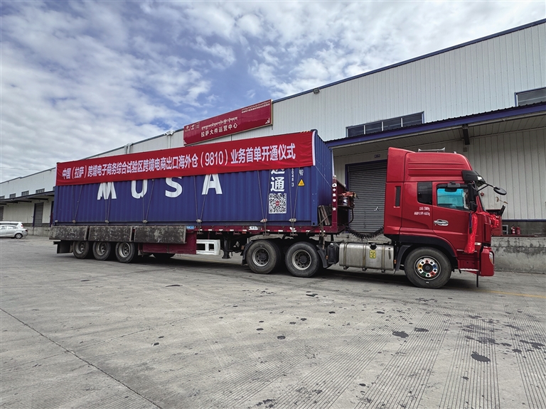 陽光透過云層,灑在堆龍德慶區(qū)城投物流園區(qū)寬廣的場地上,兩輛載有藍色集裝箱的卡車??吭谖锪鱾}前,十分引人注目。這是中國(拉薩)跨境電子商務綜合試驗區(qū)跨境電商出口海外倉“9810”業(yè)務首單,它們將跨越喜馬拉雅山,將滿載的服裝百貨、家用電器等商品送往尼泊爾加德滿都市的海外倉。