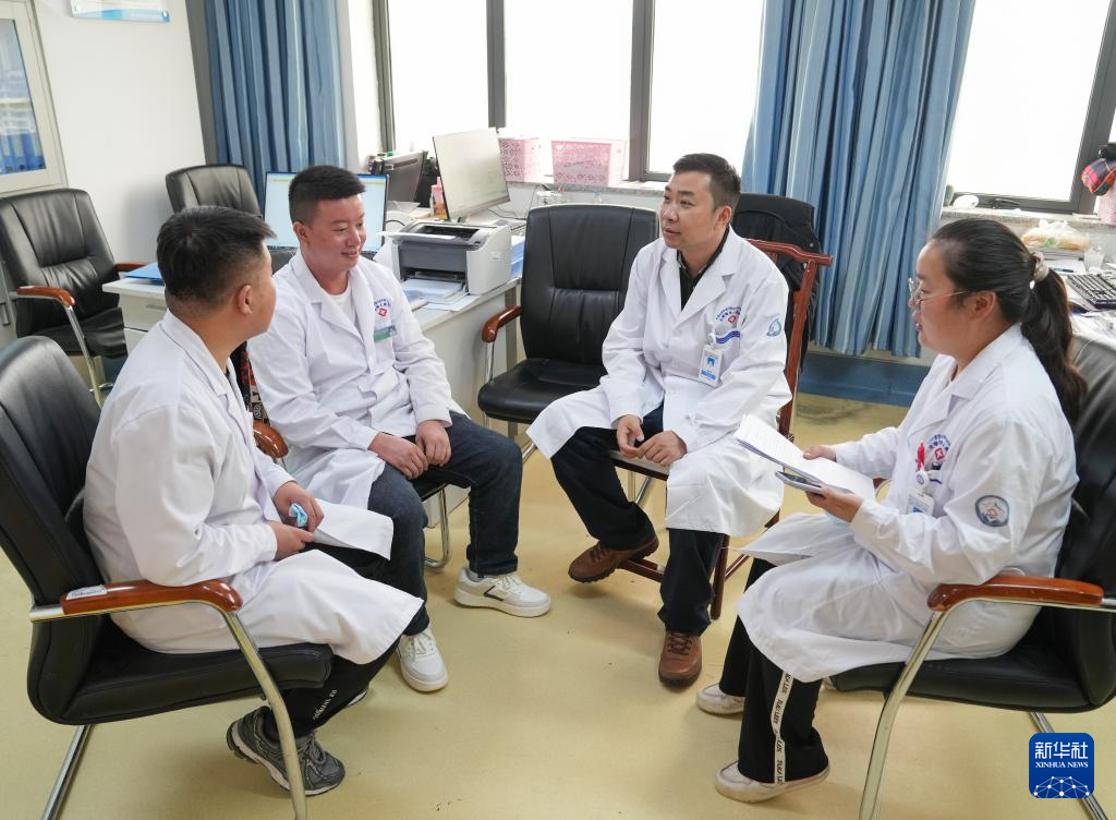 在日喀則市人民醫(yī)院,胡健衛(wèi)(右二)與徒弟段穎騫(左一)、張武(左二)、潘亞茹在辦公室內(nèi)開會(huì)(7月8日攝)。新華社記者 丁汀 攝