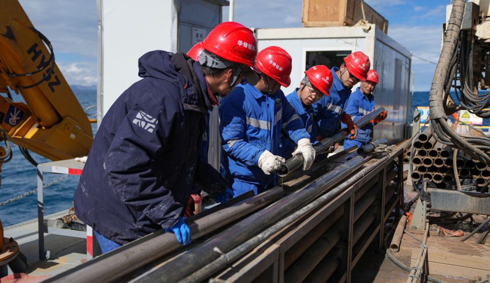 在海拔超過4700米的西藏納木錯(cuò)中心湖區(qū),21名來自五湖四海的鉆探專業(yè)技術(shù)人員,全天24小時(shí)輪班奮戰(zhàn)在面積僅200平方米的水上鉆探平臺(tái)上,協(xié)助第二次青藏科考科研人員提取湖泊巖芯樣品,這些樣本如同寶貝一樣,封存著青藏高原納木錯(cuò)地區(qū)百萬年來的環(huán)境氣候變化信息。 擔(dān)任這次湖泊巖芯鉆探任務(wù)的是四川資源集團(tuán)華鋒鉆探隊(duì)。他們從5月31日入駐科考營(yíng)地、6月6日鉆取第一批湖泊巖芯樣品以來一直奮戰(zhàn)至今。這群平均年齡31歲的鉆探隊(duì)員常年工作在高海拔地區(qū),有著豐富的鉆探經(jīng)驗(yàn),此次鉆探是他們第一次進(jìn)行高海拔湖泊鉆探。目前納木錯(cuò)鉆探深度突破400米,達(dá)到國(guó)內(nèi)高海拔深水大湖的鉆探新紀(jì)錄。這些鉆探隊(duì)員在見證奇跡,也在創(chuàng)造歷史。