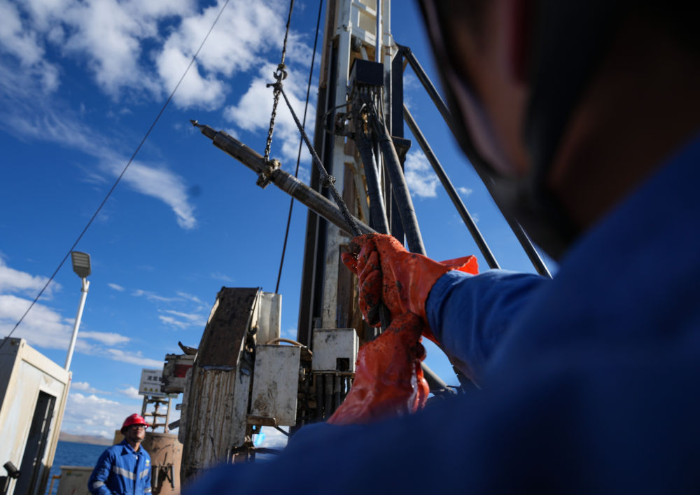 7月11日,鉆探隊(duì)員在提取湖泊巖芯。新華社記者 晉美多吉 攝
