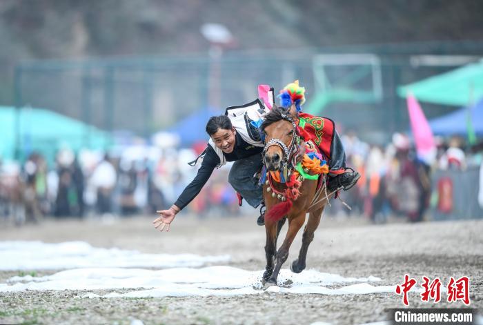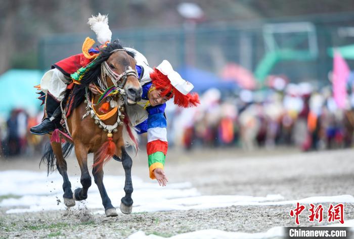 7月21日,西藏自治區(qū)拉薩市堆龍德慶區(qū)馬鎮(zhèn)朗巴村民眾賽馬歡度“望果節(jié)”?!巴?jié)”民俗已有1500多年的歷史,是國家級非物質(zhì)文化遺產(chǎn)。圖為騎手進行馬術(shù)表演。中新社記者 貢嘎來松 攝