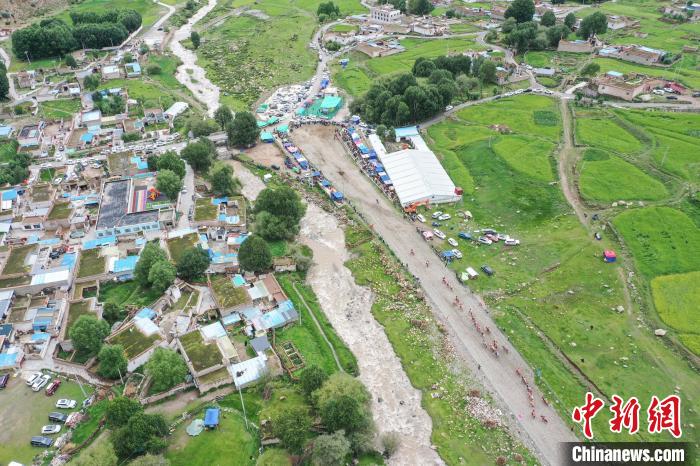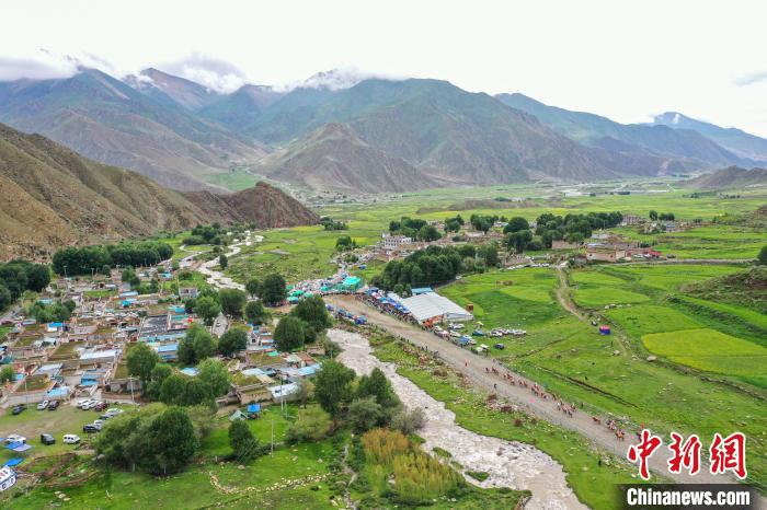 7月21日,西藏自治區(qū)拉薩市堆龍德慶區(qū)馬鎮(zhèn)朗巴村民眾賽馬歡度“望果節(jié)”?!巴?jié)”民俗已有1500多年的歷史,是國家級非物質(zhì)文化遺產(chǎn)。圖為賽馬比賽現(xiàn)場。(無人機照片)中新社記者 貢嘎來松 攝