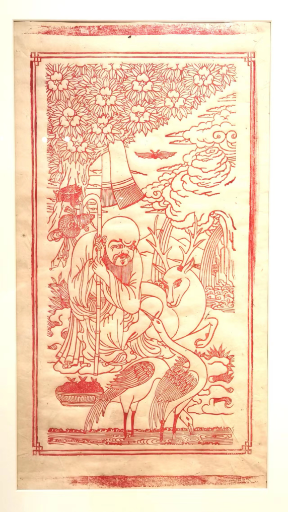 雕版拓片《六長(zhǎng)壽》,印有長(zhǎng)壽巖、長(zhǎng)壽老人、長(zhǎng)壽水、長(zhǎng)壽樹、長(zhǎng)壽鶴、長(zhǎng)壽鹿六樣元素,是西藏經(jīng)典的風(fēng)俗畫題材,其中長(zhǎng)壽老人還有內(nèi)地壽星形象的標(biāo)志性凸額。由于寓意吉祥,它出現(xiàn)在唐卡、家用藏式柜彩畫以及布達(dá)拉宮的壁畫上。