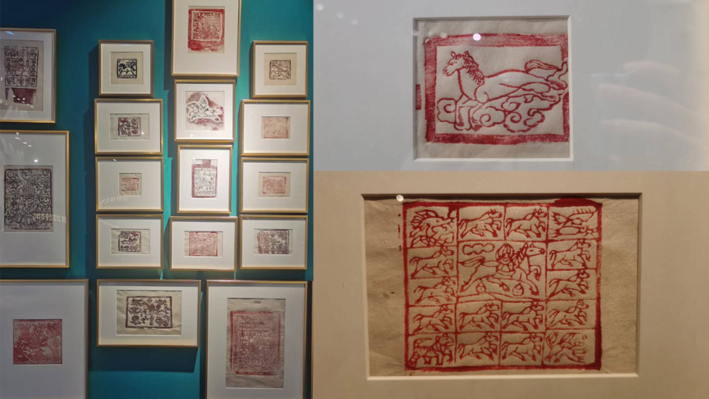 西藏懸掛山間、隨風(fēng)搖曳的成串彩旗,是從古象雄時(shí)期留傳至今的祈福物——風(fēng)馬旗。一組來(lái)自西藏各地的17件拓片告訴觀眾:古代的風(fēng)馬旗以雕版拓印而成,其上繪馬,有的肅立、有的飛奔,有的高傲、有的溫馴,種種儀態(tài)不一,還有的和龍鳳虎獅一起嬉戲。
