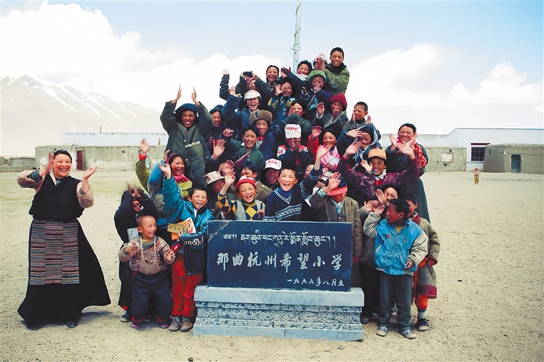 那曲杭州希望小學(xué)建成時,老師和學(xué)生在石碑前合影留念。色尼區(qū)委宣傳部提供