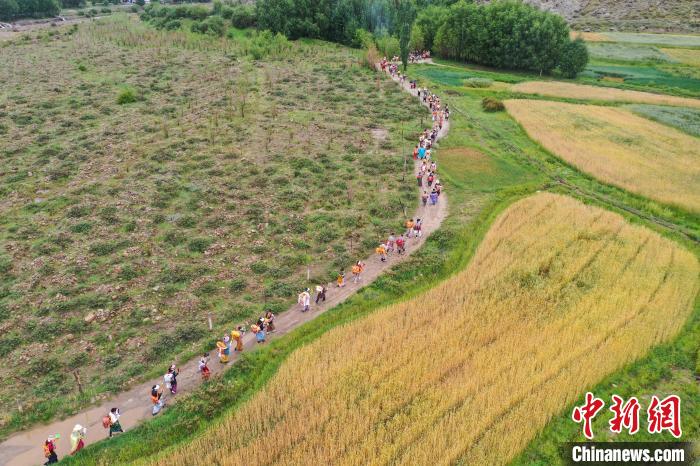 7月24日,西藏拉薩市曲水縣南木村迎來(lái)了一年一度的“望果節(jié)”。當(dāng)日,村民們盛裝打扮背上經(jīng)文,圍繞全村田園轉(zhuǎn)上一圈,轉(zhuǎn)到每一塊農(nóng)田前都要煨桑祈求風(fēng)調(diào)雨順、五谷豐登。“望果節(jié)”民俗已有1500多年的歷史,是國(guó)家級(jí)非物質(zhì)文化遺產(chǎn)。圖為曲水縣南木村村民身著盛裝背上經(jīng)文繞田。(無(wú)人機(jī)照片)中新社記者 貢嘎來(lái)松 攝