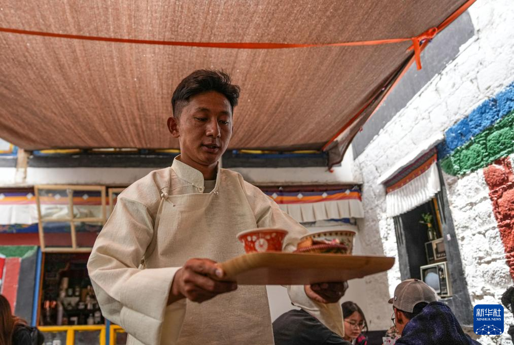 旦增特覺(jué)在為顧客奉上咖啡(7月5日攝)。新華社發(fā)(格桑雍珍 攝)