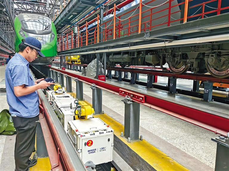 中國鐵路青藏集團(tuán)有限公司格爾木機(jī)務(wù)段拉薩機(jī)輛整備中心動集檢修庫是動車檢修基地,擔(dān)負(fù)著動車組的日常檢修、定期修及專項修任務(wù)。在暑運客流高峰期間,三組動車組全部上線運行,該段加大對動車組入庫檢修整備力度,采用智能檢測機(jī)器人對高原動集軌旁、車底部進(jìn)行自動檢測、分析及診斷,并對相關(guān)部位零部件外觀故障進(jìn)行識別和報警,實現(xiàn)了“人檢”向“機(jī)檢”的轉(zhuǎn)變。