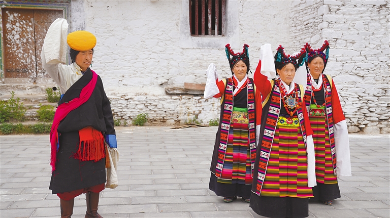 “如今,這支隊(duì)伍已發(fā)展到20多名成員,都是當(dāng)?shù)厝罕?。藝術(shù)隊(duì)經(jīng)常受邀參加各種大小晚會(huì)、重要節(jié)日演出和赴區(qū)內(nèi)外非遺展演等,其影響力和傳播力不斷提升,特別是甲瑪諧欽《和親路》受到廣泛歡迎?!奔赚斷l(xiāng)工作人員德吉卓嘎說。