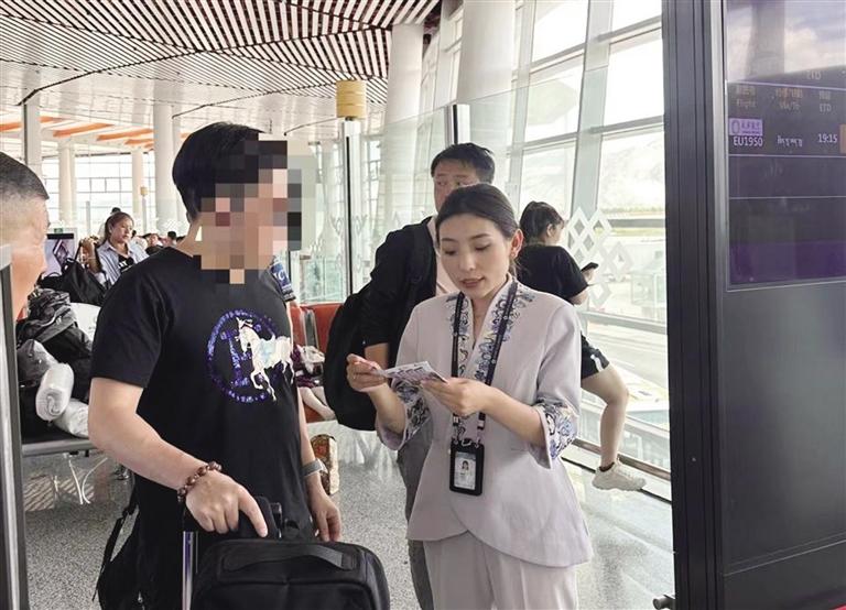 達(dá)娃曲珍在為機(jī)場旅客解答問題。