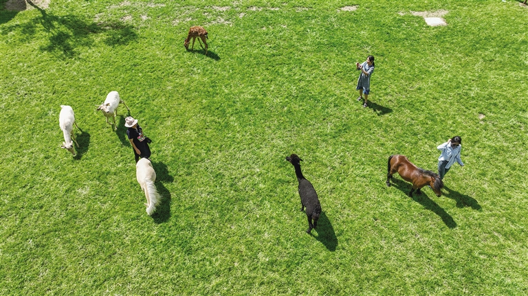 隨著車輪的滾動,我們緩緩駛?cè)肓嗣葘檲@,正巧看到了柵欄內(nèi)兩只一棕一白憨態(tài)可掬的羊駝,正在不緊不慢地享受著游客的投喂,身旁一只剛出生的小羊駝依偎在媽媽的懷中。此時,一名小朋友追著好動的矮腳馬想要騎兩圈,奈何矮腳馬活潑好動,小朋友幾番努力下都沒能如愿,真是可愛極了。柵欄內(nèi)還有幾只四角綿羊正悠閑地吃著青草,沐浴陽光。記者看到,在萌寵樂園孩子們可以在家長的陪伴下,近距離接觸這些萌寵,親手喂食、撫摸,感受生命的奇妙與溫暖。
