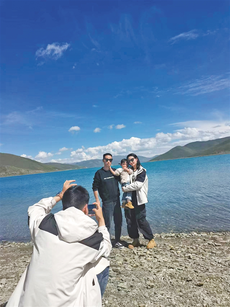 游客在羊卓雍錯(cuò)拍照留念。記者 張麗萍 攝
