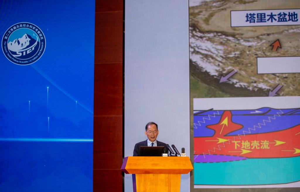 8月18日,第二次青藏科考隊(duì)隊(duì)長(zhǎng)姚檀棟院士在拉薩對(duì)本次科考十大任務(wù)的重要成果進(jìn)行集中發(fā)布。新華社記者 姜帆 攝