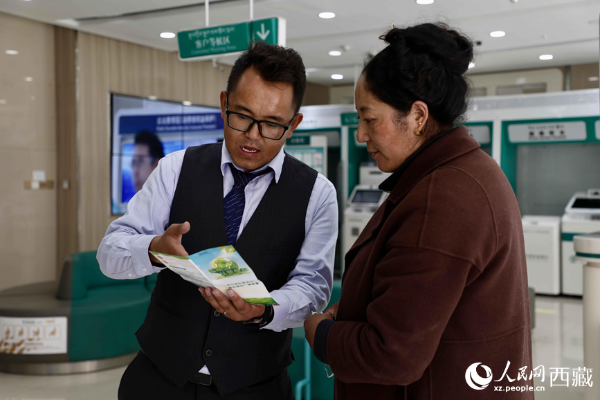 農(nóng)行洛扎縣支行工作人員在向辦事群眾講解“個人碳賬戶”。人民網(wǎng)記者 次仁羅布攝