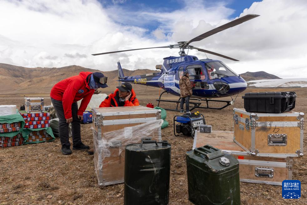 9月9日,徐柏青(中)和同事安排直升機將科考物資從海拔5400米的第二次青藏科考普若崗日冰原大本營運往海拔6100米的“Dome.C”點。新華社記者 姜帆 攝