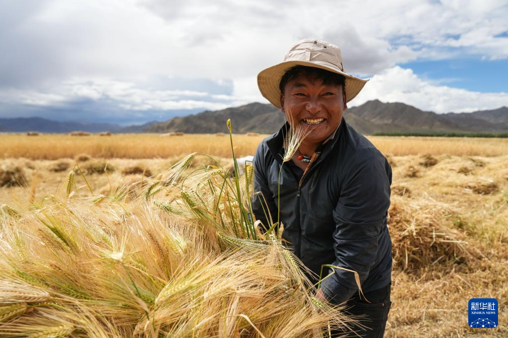 9月10日,西藏日喀則市白朗縣巴扎鄉(xiāng)農(nóng)民在收獲青稞。新華社記者 劉洲鵬 攝