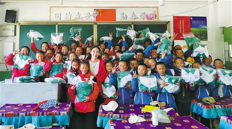 2014年至今,日喀則市南木林縣黨員扎西拉姆積極投身慈善事業(yè),用無私奉獻詮釋著鄰里守望相助和民族團結(jié)的真諦。圖為扎西拉姆(中)與受助孩子合影。