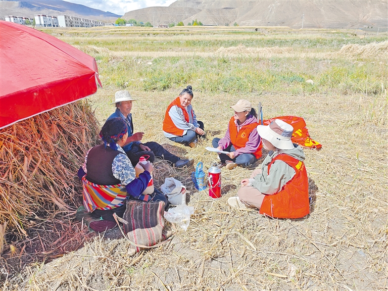 圖為民族團結(jié)進步宣傳活動月期間,薩迦縣志愿者在田間向群眾宣講民族團結(jié)相關(guān)知識。
