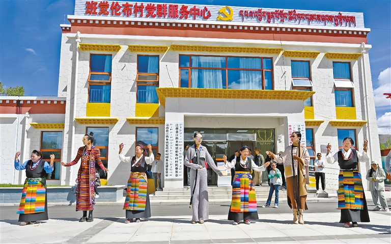 圖為9月,在日喀則市江孜縣江熱鄉(xiāng)班覺倫布村舉辦的西藏氆氌系列發(fā)布秀結(jié)束后,群眾齊跳鍋莊,跳出民族團結(jié)“同心圓”。