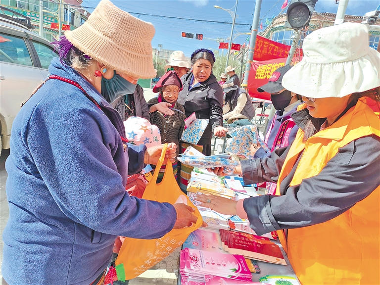圖為薩迦縣民族團結(jié)進步宣傳活動月啟動儀式上,工作人員發(fā)放宣傳冊。
