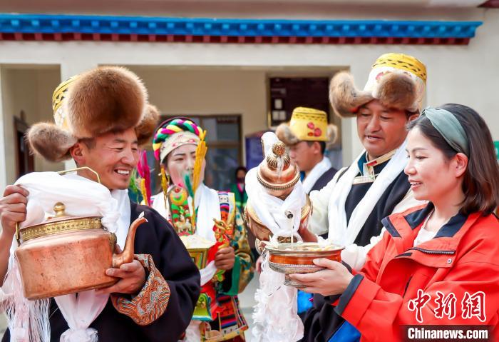 圖為粵港澳大灣區(qū)文旅商和援藏老干部代表等體驗青稞酒。山南市文化和旅游局 供圖