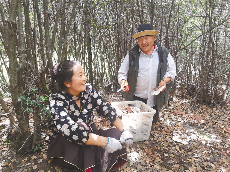 圖為林芝市工布江達縣甲熱村村民在林下采摘靈芝。記者 周輝 攝