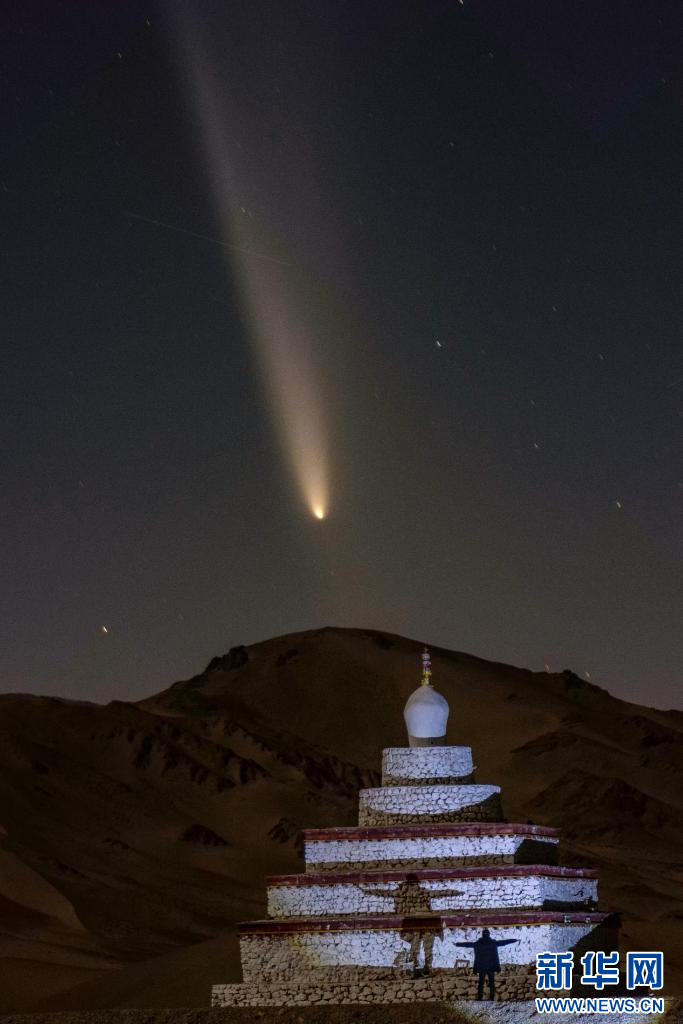 10月13日,在西藏阿里地區(qū)獅泉河鎮(zhèn)熱拉紅堡白塔拍攝的彗星。新華網發(fā) 曹枝清攝