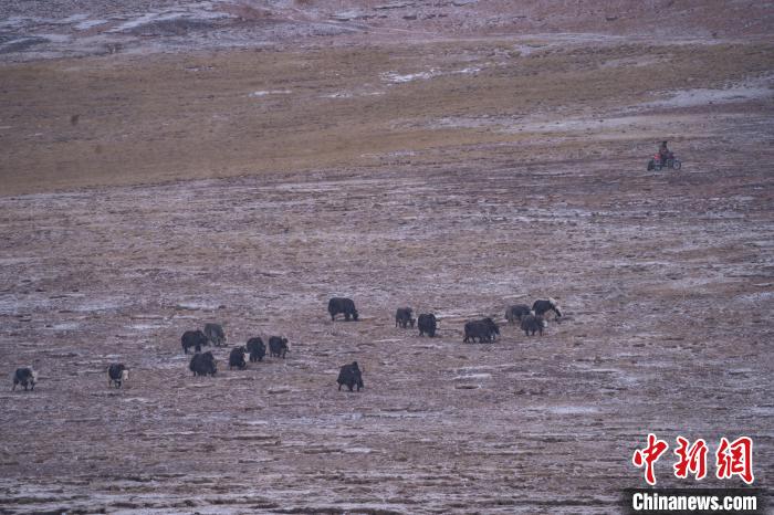10月23日,西藏自治區(qū)那曲市安多縣多瑪鄉(xiāng)牧民在雪中放牧。當(dāng)日,一場(chǎng)雪將藏北草原裝扮得如詩(shī)如畫。牧民們?cè)谶@銀裝素裹的天地間,開始了雪中放牧的生活。牛羊在雪地中悠閑覓食,牧民駕駛著摩托車,在雪中放牧,形成了一幅動(dòng)人的風(fēng)景畫。圖為牦牛在草原上覓食。中新社記者 貢嘎來(lái)松 攝