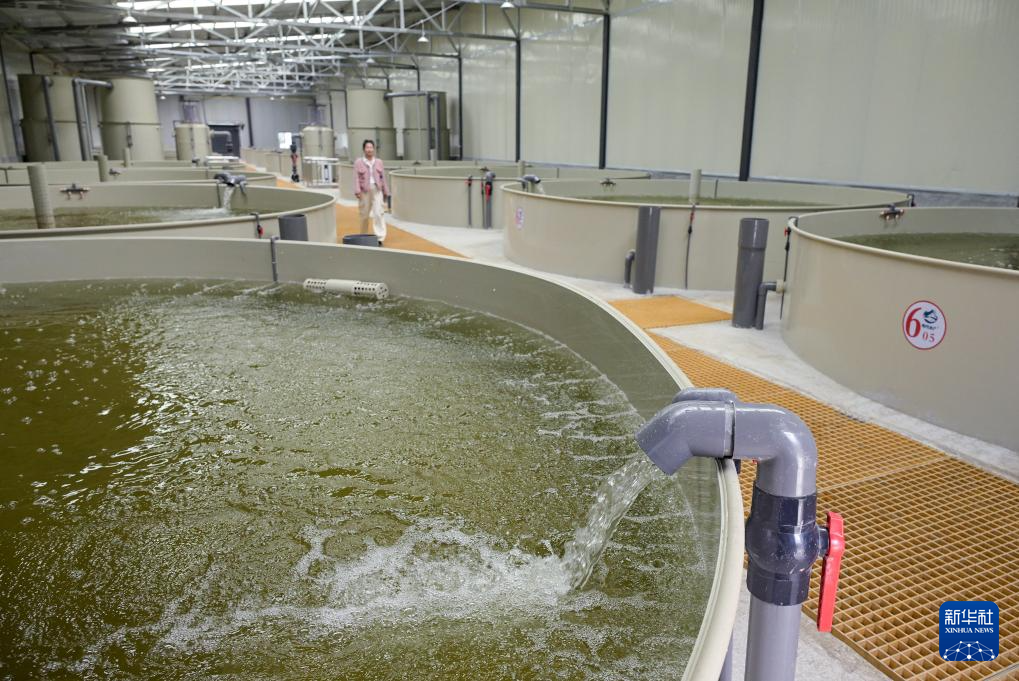 這是在西藏林芝市米林農(nóng)場(chǎng)的粵林高原漁業(yè)科技園育苗廠房?jī)?nèi)拍攝的育苗水池(10月24日攝)。新華社記者 李賀 攝