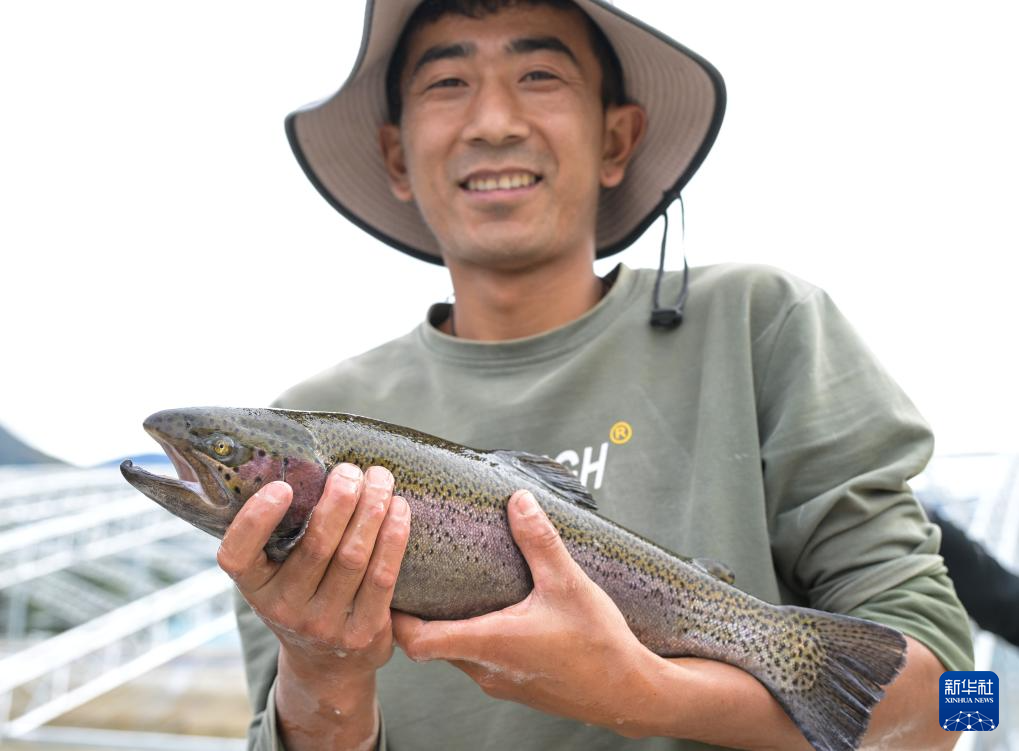 在西藏林芝市米林農(nóng)場(chǎng)的粵林高原漁業(yè)科技園工作的藏族小伙尼瑪旺堆在展示本地飼養(yǎng)的虹鱒魚(yú)(10月24日攝)。新華社記者 李賀 攝